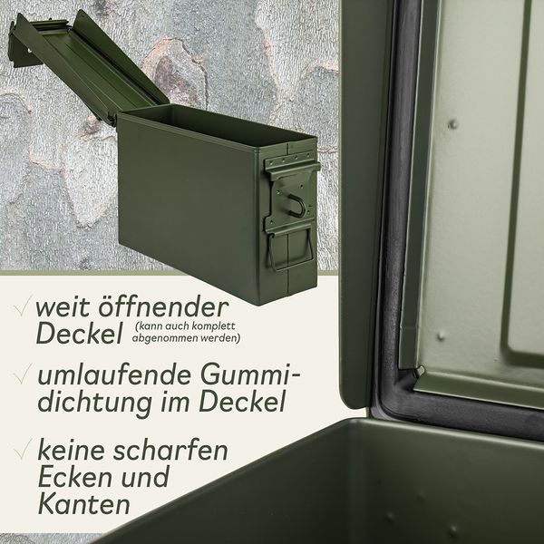 Der Trucky Munitionskoffer im US-Army-Look überzeugt durch seine robuste Stahlkonstruktion, olivgrüne Optik und praktische Vielseitigkeit.