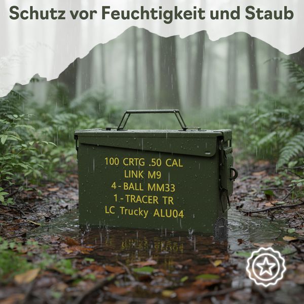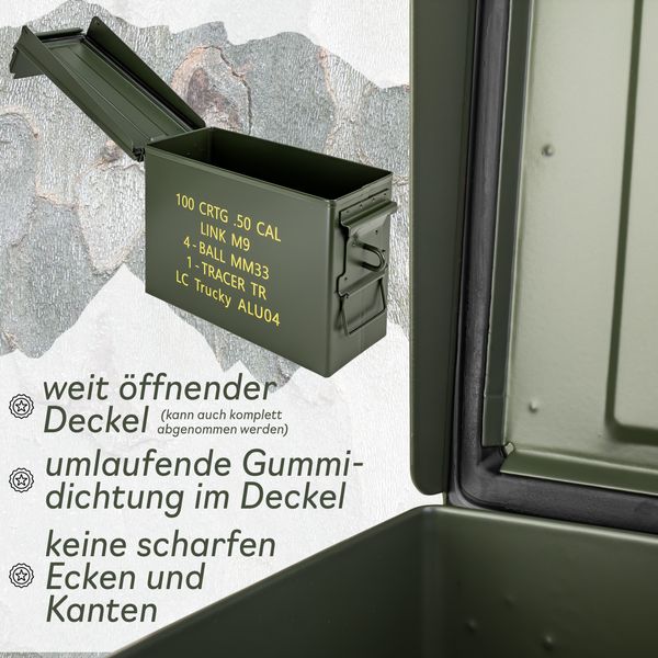 Der Trucky Munitionskoffer im US-Army-Look überzeugt durch seine robuste Stahlkonstruktion, olivgrüne Optik und praktische Vielseitigkeit.
