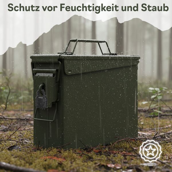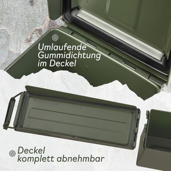 Der Trucky Munitionskoffer im US-Army-Look überzeugt durch seine robuste Stahlkonstruktion, olivgrüne Optik und praktische Vielseitigkeit.