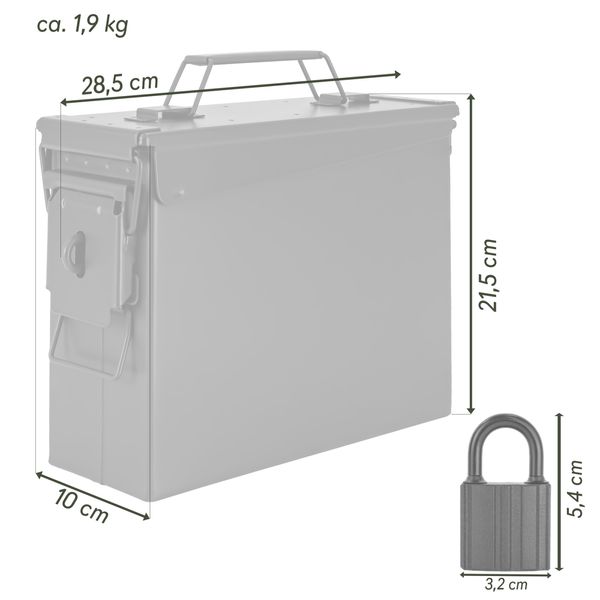 • PRODUKTINFORMATION: Metallbox aus verzinktem Stahl, 28 x 10 x 22 cm, Schloss aus Eisen (beschichtet, Bügel gummiert), 5,4 x 3,2 x 1 cm / LIEFERUMFANG: 1x Box, 1x Schloss, 3x Schlüssel / (HINWEIS: Die Box ist nicht zur Aufbewahrung von Waffen und Munition geeignet. Sie entspricht nicht den gesetzlichen Anforderungen gemäß § 36 WaffG.)