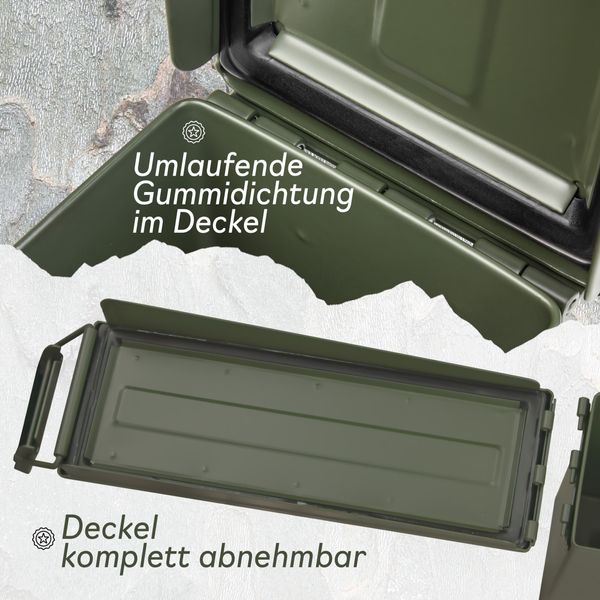 Der Trucky Munitionskoffer im US-Army-Look überzeugt durch seine robuste Stahlkonstruktion, olivgrüne Optik und praktische Vielseitigkeit.