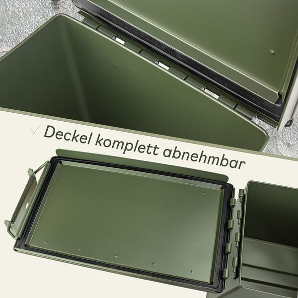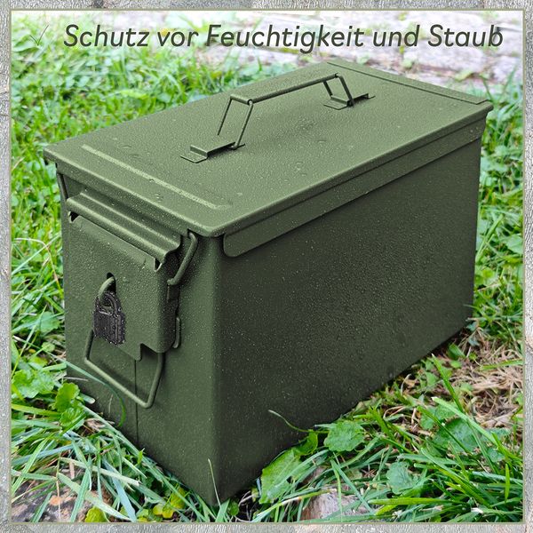Der Trucky Munitionskoffer im US-Army-Look überzeugt durch seine robuste Stahlkonstruktion, olivgrüne Optik und praktische Vielseitigkeit.