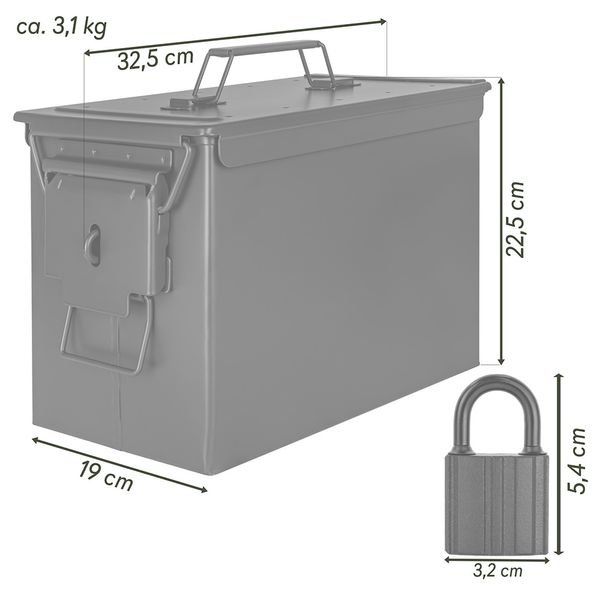• PRODUKTINFORMATION: Metallbox aus verzinktem Stahl, 33 x 19 x 23 cm, Schloss aus Eisen (beschichtet, Bügel gummiert), 5,4 x 3,2 x 1 cm / LIEFERUMFANG: 1x Box, 1x Schloss, 3x Schlüssel / (HINWEIS: Die Box ist nicht zur Aufbewahrung von Waffen und Munition geeignet. Sie entspricht nicht den gesetzlichen Anforderungen gemäß § 36 WaffG.)