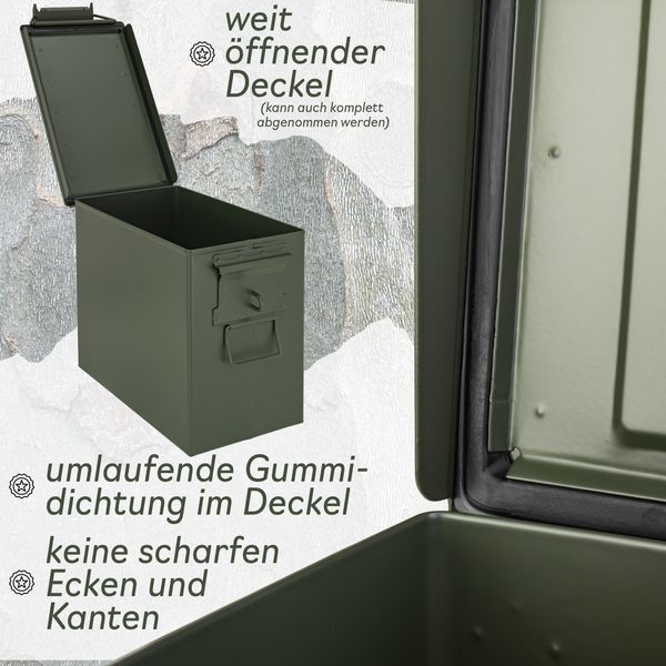 Der Trucky Munitionskoffer im US-Army-Look überzeugt durch seine robuste Stahlkonstruktion, olivgrüne Optik und praktische Vielseitigkeit.