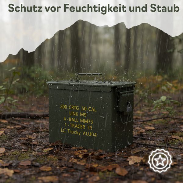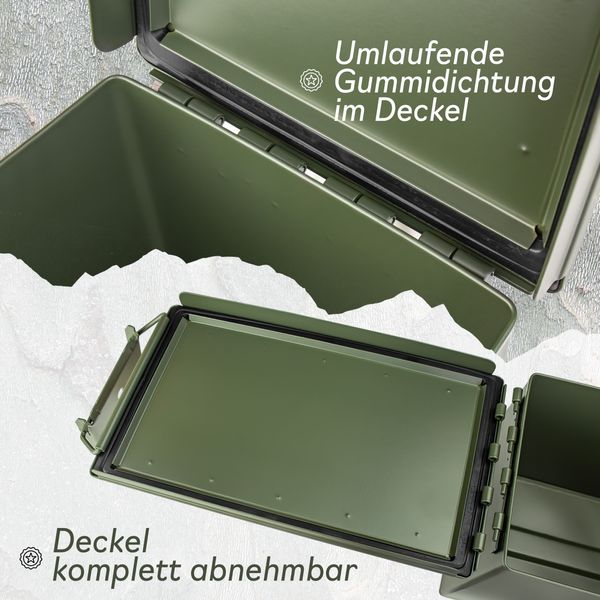 Der Trucky Munitionskoffer im US-Army-Look überzeugt durch seine robuste Stahlkonstruktion, olivgrüne Optik und praktische Vielseitigkeit.
