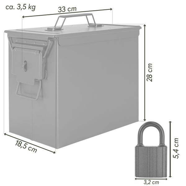 • PRODUKTINFORMATION: Metallbox aus verzinktem Stahl, 33 x 19 x 28 cm, Schloss aus Eisen (beschichtet, Bügel gummiert), 5,4 x 3,2 x 1 cm / LIEFERUMFANG: 1x Box, 1x Schloss, 3x Schlüssel / (HINWEIS: Die Box ist nicht zur Aufbewahrung von Waffen und Munition geeignet. Sie entspricht nicht den gesetzlichen Anforderungen gemäß § 36 WaffG.)