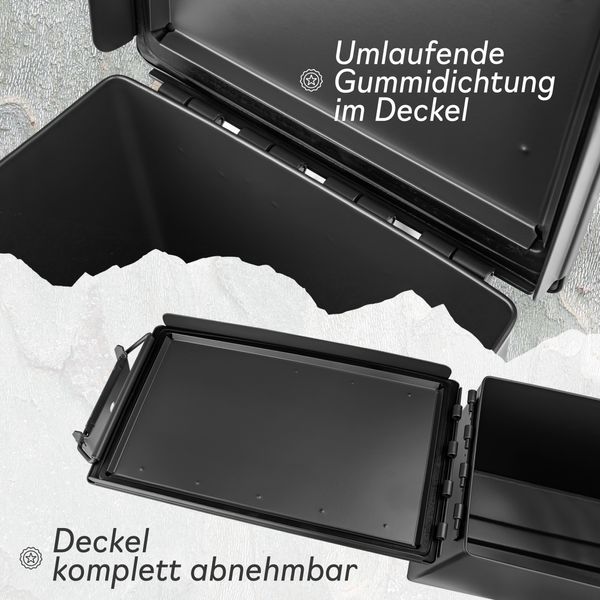 • SICHERHEIT: Mit Gummidichtung in Inneren des Deckels - luft-, dampf- und spritzwassergeschützt verschließbar. Der Deckel kann mit dem wetterfesten Vorhängeschloss gesichert werden.