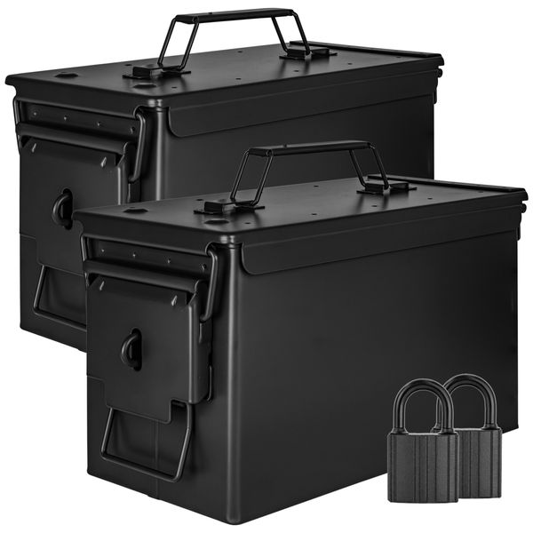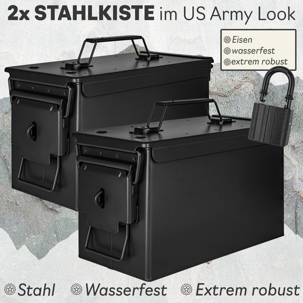 Trucky Set 2x Munitionsbox mit Schloss Ammo Box Metallkiste Metallbox Munitionskiste Aufbewahrungsbox mit Deckel 31 x 16 x 19 cm Army Schwarz Metall