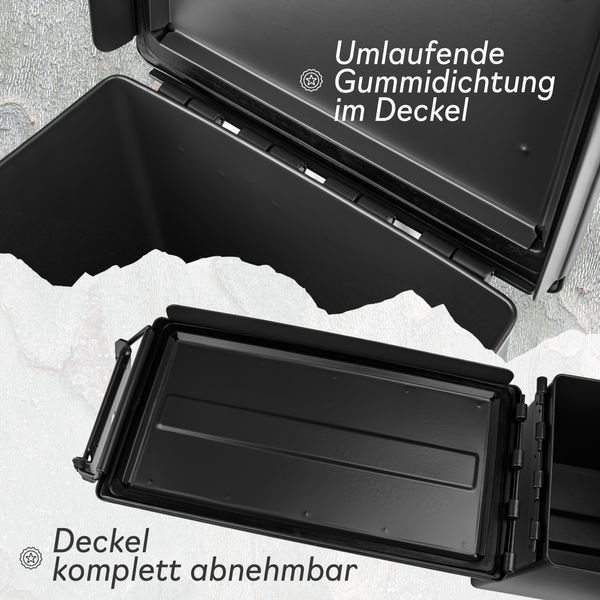 • SICHERHEIT: Mit Gummidichtung in Inneren des Deckels - luft-, dampf- und spritzwassergeschützt verschließbar. Der Deckel kann zusätzlich mit Vorhängeschloss gesichert werden.
