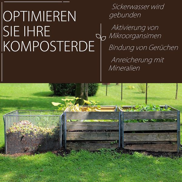 Kompostoptimierung: Verteilen Sie großzügig eine Schicht des Pulvers auf der Komposterde. Dadurch wird Sickerwasser gebunden, Mikroorganismen werden aktiviert und unangenehme Gerüche sowie CO2 werden gebunden. Die Komposterde wird zudem mit wertvollen Mineralien angereichert.