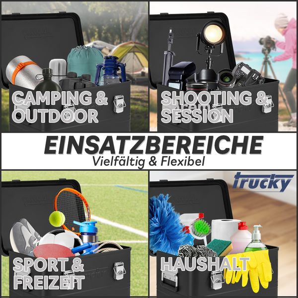 MATERIAL UND MAßE: Unsere abschließbaren Alu Kisten aus Aluminium Metall bieten eine ideale Balance zwischen Schutz und Gewicht. Wählen Sie die Box, die Sie für Ihren Einsatz benötigen, von klein bis groß. Sie können wählen zwischen Boxen mit folgen Fasungsvermögen: 30 L, 50 L, 65 L, 85 L oder 135 L.