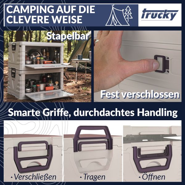 HANDHABUNG: Die Transportkiste verfügt über eine Klappe auf der Frontseite, die auch bei geschlossenem Deckel einen bequemen Zugriff auf den Inhalt ermöglicht. Zwei Riegel an jeder Seite sorgen dafür, dass die Klappe fest und sicher verschlossen bleibt, ohne dass der Inhalt herausfällt. Der Deckel kann nicht nur als Ablagefläche dienen, sondern auch als Campingtisch, Tablett oder Arbeitsplatte genutzt werden.