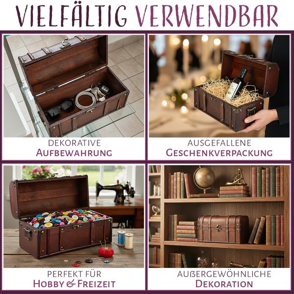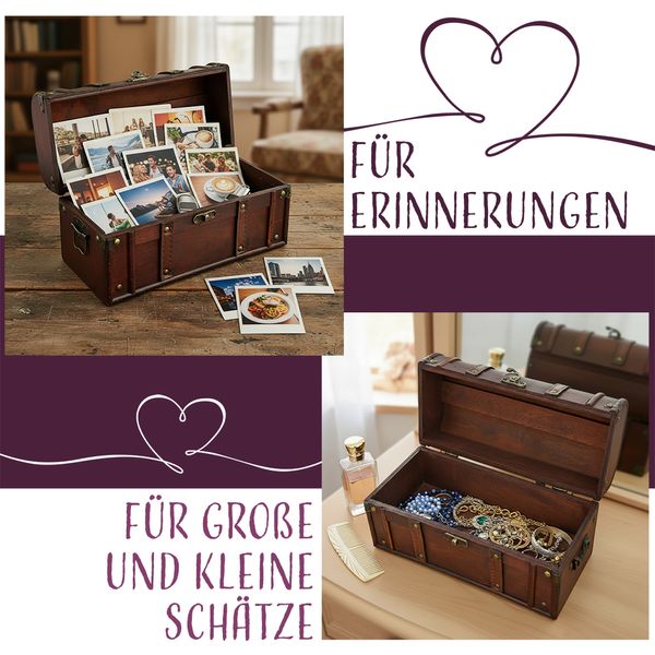 - UNIKAT: Jede Schatzkiste wird sorgfältig aus Holz gefertigt. Natürliche Maserungen, leichte Unregelmäßigkeiten und gewollte Gebrauchsspuren verleihen ihr einen authentischen Vintage-Charakter.