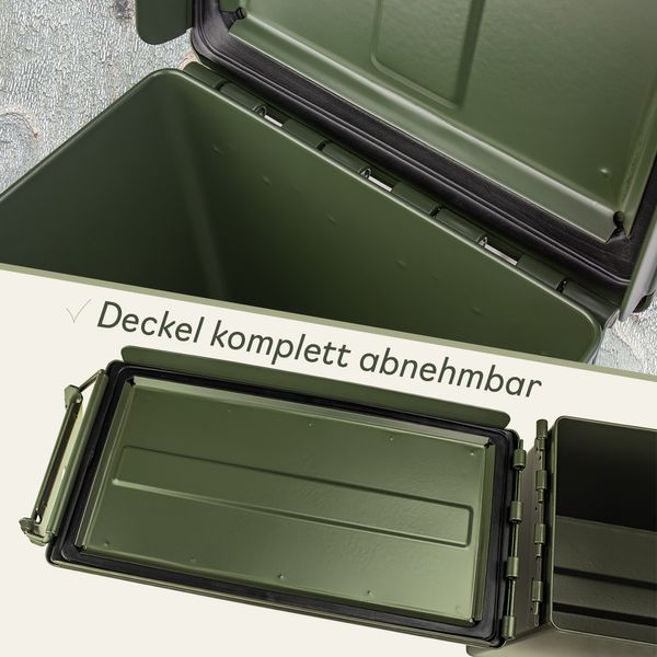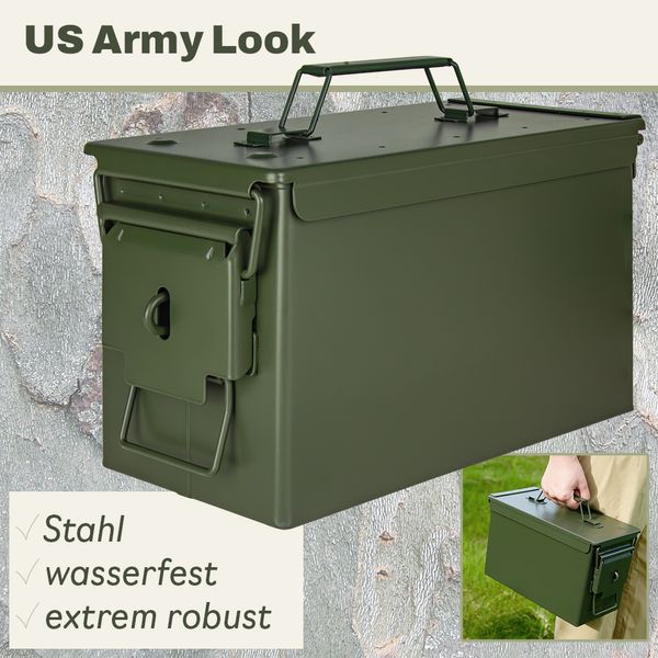 Der Trucky Munitionskoffer im US-Army-Look überzeugt durch seine robuste Stahlkonstruktion, olivgrüne Optik und praktische Vielseitigkeit.