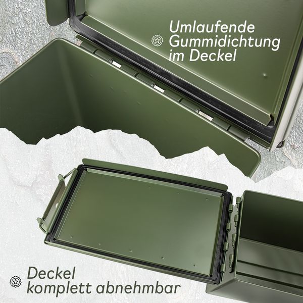 Der Trucky Munitionskoffer im US-Army-Look überzeugt durch seine robuste Stahlkonstruktion, olivgrüne Optik und praktische Vielseitigkeit.