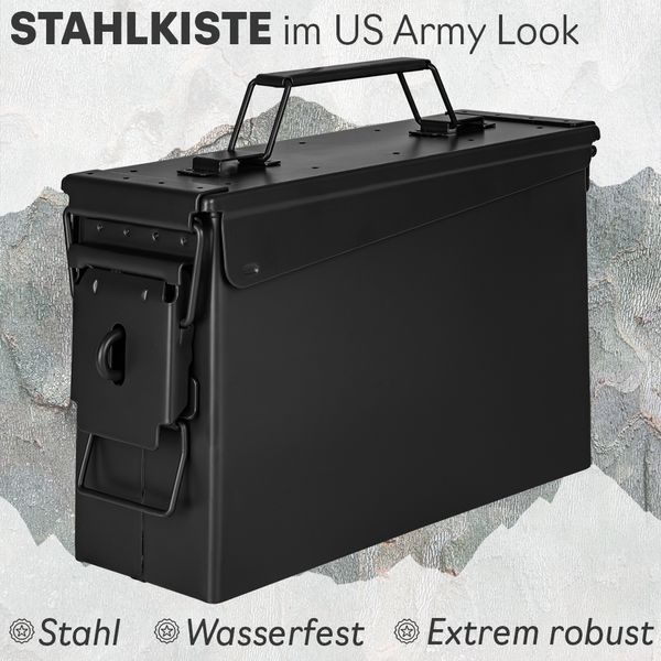 Der Trucky Munitionskoffer im US-Army-Look überzeugt durch seine robuste Stahlkonstruktion, schwarze Optik und praktische Vielseitigkeit.