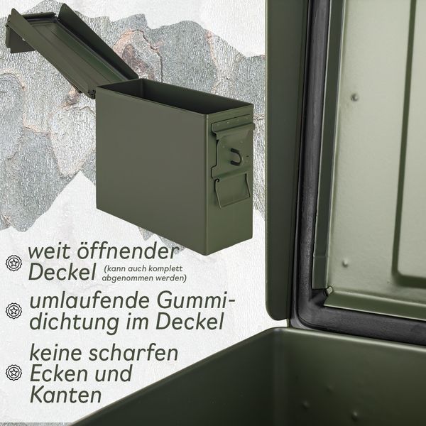 Der Trucky Munitionskoffer im US-Army-Look überzeugt durch seine robuste Stahlkonstruktion, olivgrüne Optik und praktische Vielseitigkeit.