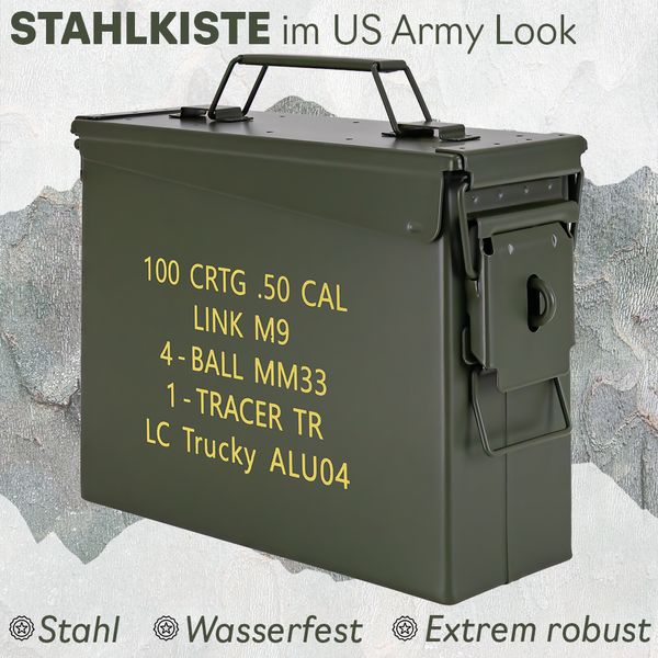 Der Trucky Munitionskoffer im US-Army-Look überzeugt durch seine robuste Stahlkonstruktion, olivgrüne Optik und praktische Vielseitigkeit.