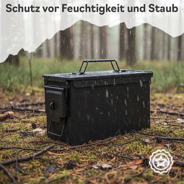 1x Metallkiste (HINWEIS: Die Box ist nicht zur Aufbewahrung von Waffen und Munition geeignet. Sie entspricht nicht den gesetzlichen Anforderungen gemäß § 36 WaffG.)