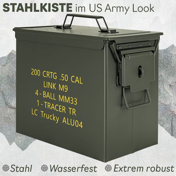 Der Trucky Munitionskoffer im US-Army-Look überzeugt durch seine robuste Stahlkonstruktion, olivgrüne Optik und praktische Vielseitigkeit.