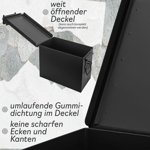 1x Metallkiste (HINWEIS: Die Box ist nicht zur Aufbewahrung von Waffen und Munition geeignet. Sie entspricht nicht den gesetzlichen Anforderungen gemäß § 36 WaffG.)