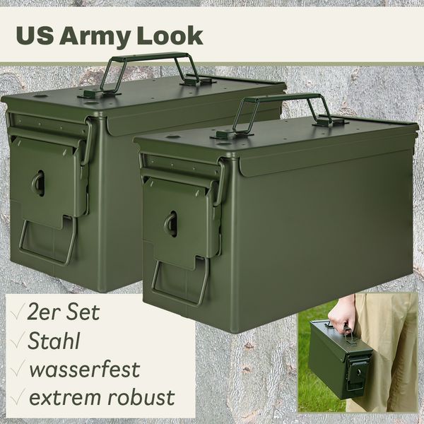 Trucky Set 2x Munitionsbox Ammo Box Metallkiste Metallbox Munitionskiste Aufbewahrungsbox mit Deckel 31 x 16 x 19 cm Army Grün Metall