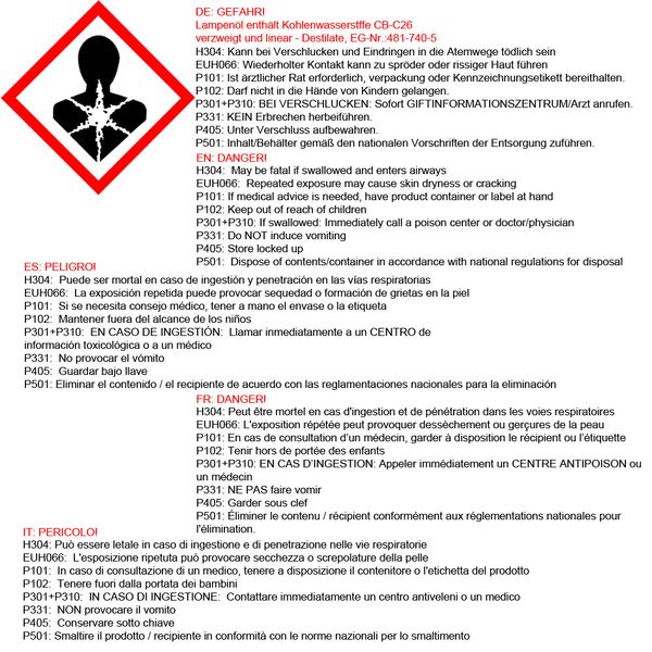 Lampenöl enthält Kohlenwasserstoffe CB-C26 verzweigt und linear - Destillate, EG-Nr. 481-740-5.