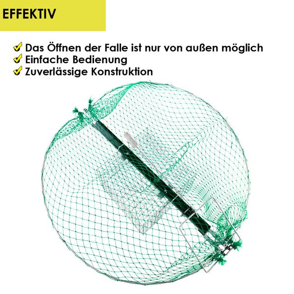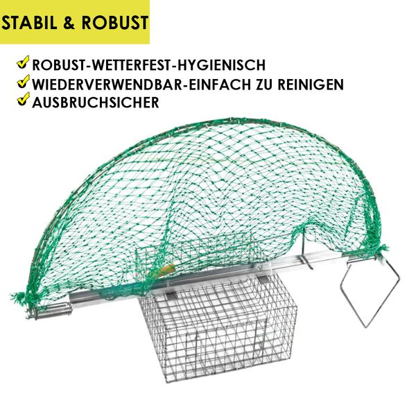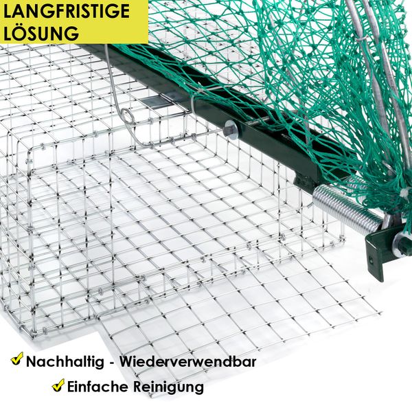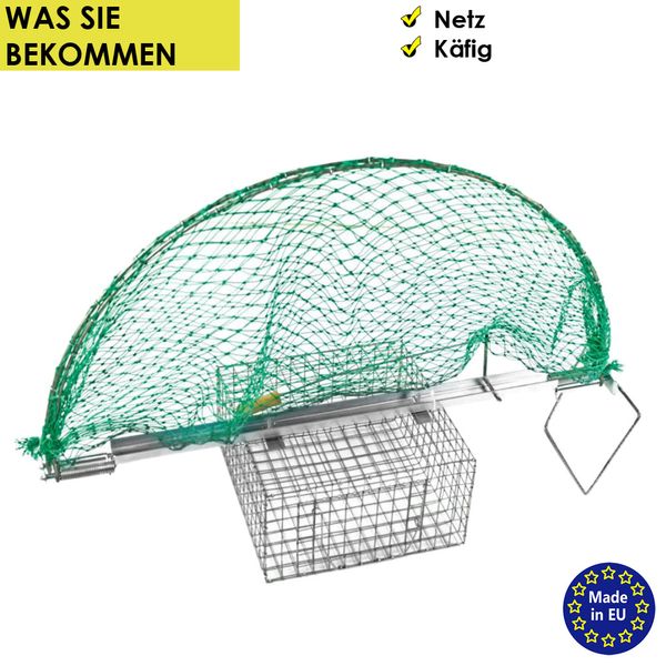 - PRODUKTINFORMATIONEN: Lieferumfang: 1x Vogelfalle (Größe und Modell je nach Auswahl), (4x Erdnagel mit Modell 01); Material: Stahl -feuerverzinkt, Polyethylen (Netz) / (Je nach Auswahl Modell). BITTE BEACHTEN SIE: Die Regelungen und Vorschriften für die Fangjagd / Fallenjagd in Ihrem Bundesland gemäß dem Bundesjagdgesetz (BJagdG). Beachten Sie auch Tierschutzvorschriften und den Artenschutz.