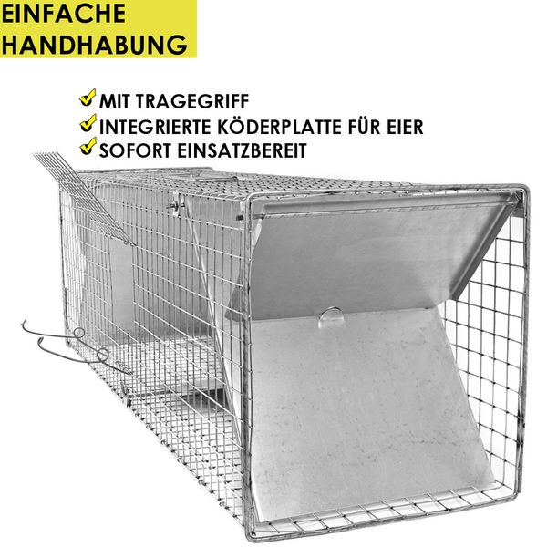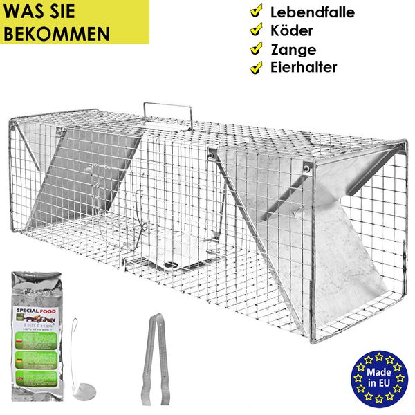 • PRODUKTINFORMATIONEN: Lieferumfang: 1x Lebendfalle, 1x Köder-Zange, 1x Ei- Köder-Halter, 1x Köderdrops und 1x Anleitung; Material: Stahl -Feuerverzinkt, Maße: 102 x 29 x 31 cm BITTE BEACHTEN SIE: Die Regelungen und Vorschriften für die Fangjagd / Fallenjagd in Ihrem Bundesland gemäß dem Bundesjagdgesetz (BJagdG). Beachten Sie auch Tierschutzvorschriften und den Artenschutz. Vorsichtsmaßnahmen / Sicherheitshinweise: Tierfallen gehören nicht in Kinderhände! Beaufsichtigen Sie Ihr Kind / Ihre Kinder in der Nähe von selbst aufgestellten Fallen. Belassen Sie die Tiere bis zu ihrer Freilassung in der Falle. Tragen Sie immer robuste Handschuhe.Wir übernehmen keinerlei Verantwortung für Verletzungen oder Beschädigungen, die durch unsachgemäße Nutzung oder falsche Handhabung der Falle entstehen.