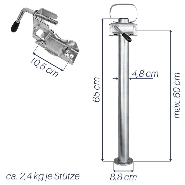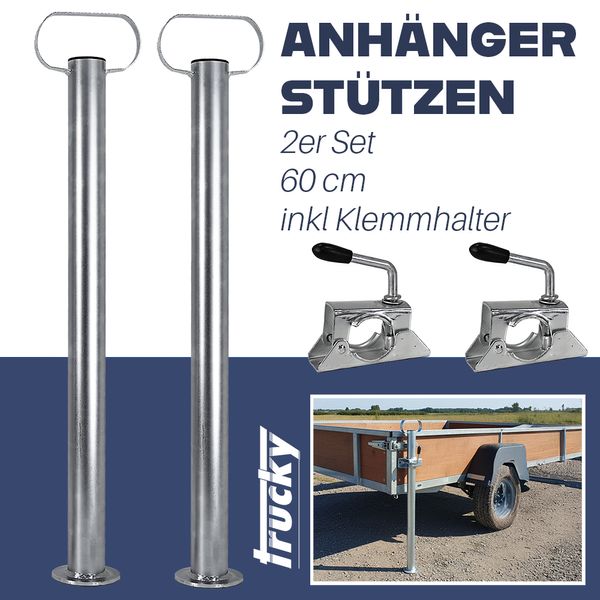 - PRODUKTIONFORMATION: Material: Stahl verzinkt /// Maße: 60 cm (Länge), 4,8 cm (Durchmesser) /// Lieferumfang: 2 x Anhängerstützen (60 cm, Durchmesser 4,8 cm ), 2 x Klemmhalter mit Befestigungslöchern (10,5 cm Abstand)