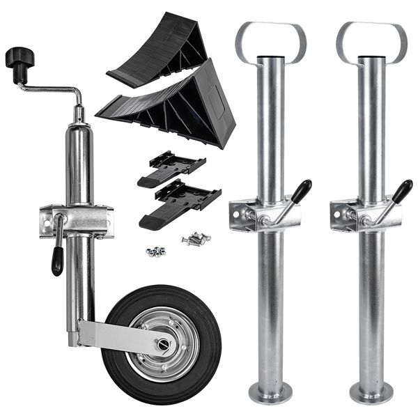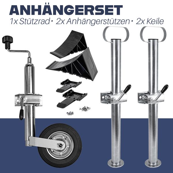 • Lieferumfang des Komplettsets: 1 × Stützrad mit Klemmhalter, 2 × Anhängerstützen (60 cm, Ø 4,8 cm) inkl. 2 × Klemmhalter, 2 × Unterlegkeile inkl. 2 × Halterungen und Schrauben & Muttern