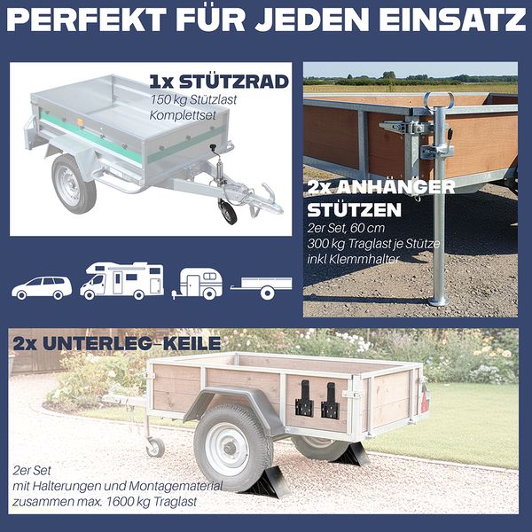 • Komplettes Set für Anhänger: Enthält 1x Stützrad, 2x Anhängerstützen und 2x Unterlegkeile für sichere und stabile Abstellung von kleinen bis mittleren Anhängern und Wohnwagen