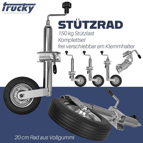 • Stützrad-Komplettset: Höhenverstellbar (48 - 73 cm) mit robustem Vollgummireifen, Stützlast bis 150 kg, einfache Montage mit Klemmhalter (Lochabstand: 10,5 cm), Material: Stahl verzinkt